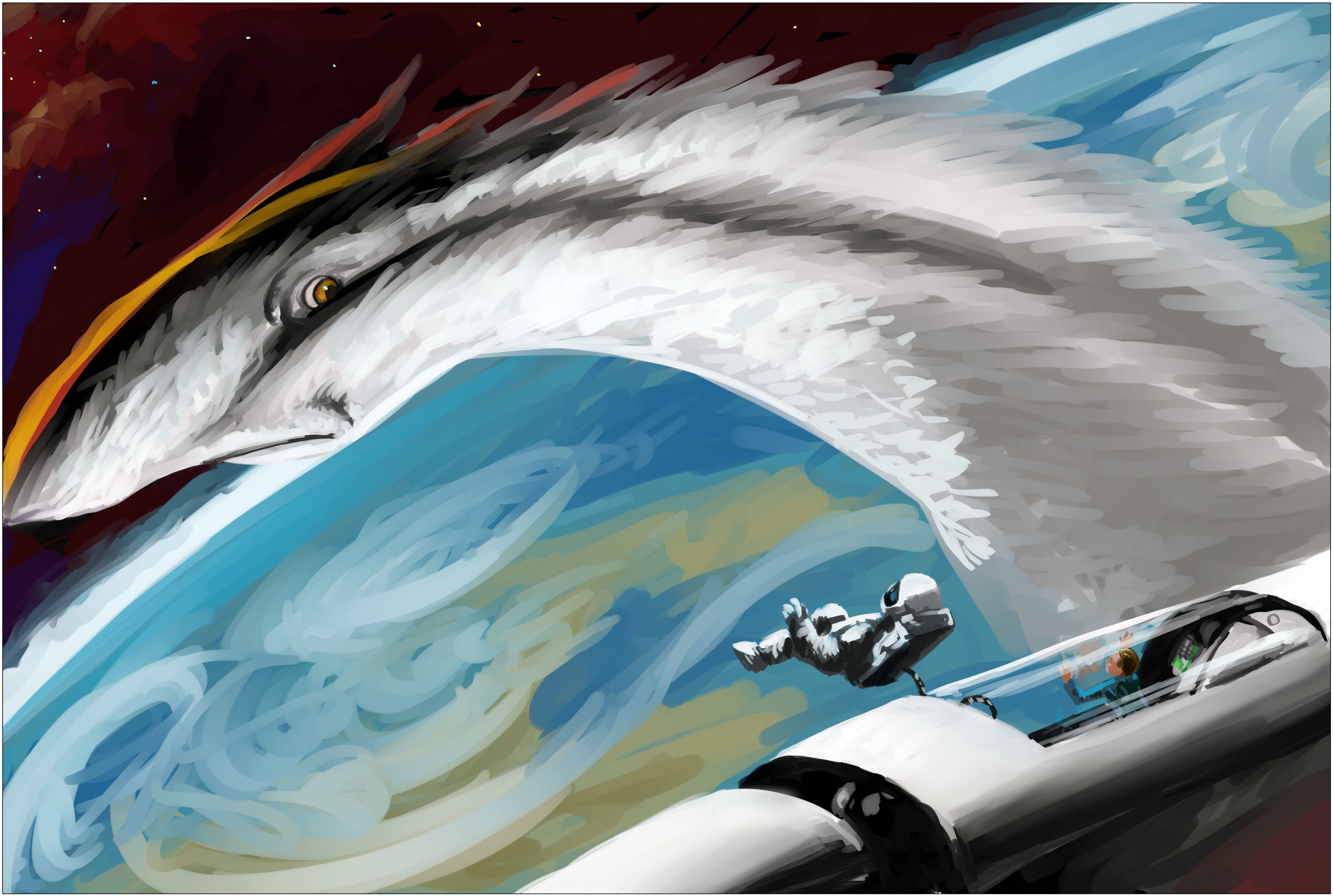 Paralelamente a ese evento, yo estaba comenzando un relato corto sobre un universo muy posterior al nuestro, en el que el Sol se está convirtiendo en una gigante roja, y, tras la extinción de la humanidad, aparecieron dos especies inteligentes nuevas: los Xarwen, ya extinguidos, y los LauKlars. Los LauKlars son descendientes de aves de la Tierra, que han evolucionado y se han expandido por la galaxia.